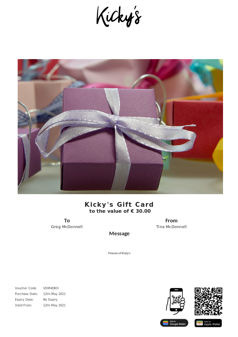 Kicky's allows you to purchase instantly printable gift vouchers, special offers and tickets using the Voucher Connect platform.